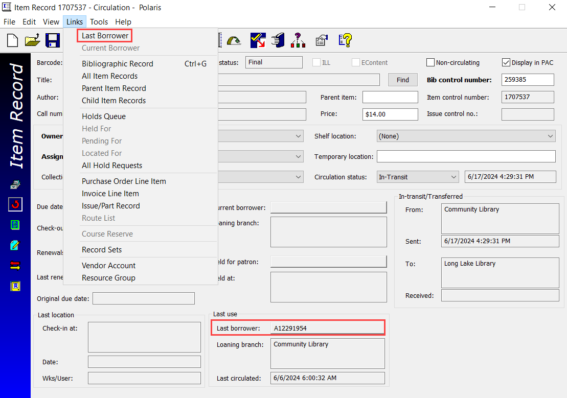 You can configure Polaris to display information about an item's last borrower on the Item Record workform. When the Last use patron display Patron Services parameter is set to Yes, Polaris displays the following elements on the Item Record workform: