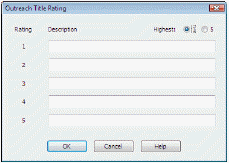 - (System level only.) Double-click the Patron Services parameter Outreach title rating. The Outreach Title Rating dialog box opens, where you define the 1-5 rating scale.