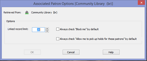 You can use the Associated patron options parameter to set the maximum number of linked records, specify whether patrons are blocked when their associated patrons are blocked, and whether patrons are allowed to pick up and check out items that are held for their associated patrons. For information on how these settings affect circulation, see Block and Allow settings for associated patrons.