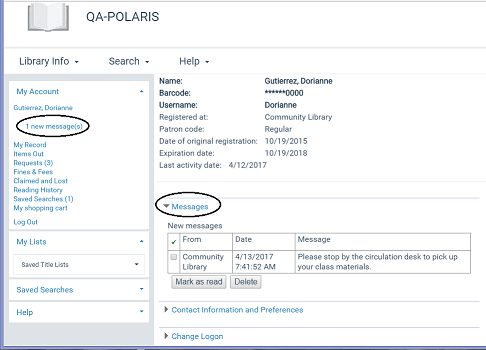 The My Record page in the PAC patron account displays a Messages drawer that the user clicks or taps to expand the Messages area. The side portion of every page of the patron account also displays counts of new and read messages that are convenient links to open the Messages area of the account. When the Messages area is expanded, the patron can check messages and mark them as read or delete them.
