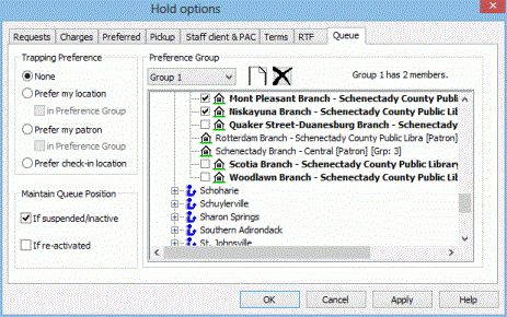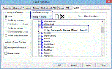 When you open the Hold options > Queue tab at the System level, you can set up optional trapping preference groups, which apply trapping preferences to a designated group of branches. You may find this feature useful in a consortium where various groups of organizations are far apart or have very different hold request policies. If you use trapping preference groups, you can specify whether you want preference within the group to be applied based on the hold pickup location branch or the patron's registered branch.