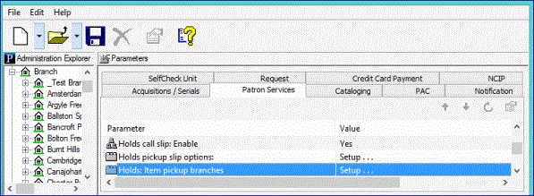 - In the Administration Explorer tree view, open the Parameters folder for the branch, and click the Patron Services tab in the details view.
