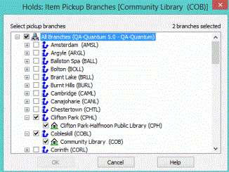 - Select OK to add the branches to the Pickup at list for the branch's item records and close the dialog box.