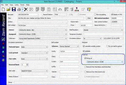 The branch-level Polaris Administration patron services parameter Holds: Item pickup branches specifies the branches that appear in the Pickup at list in the Item Record workform.