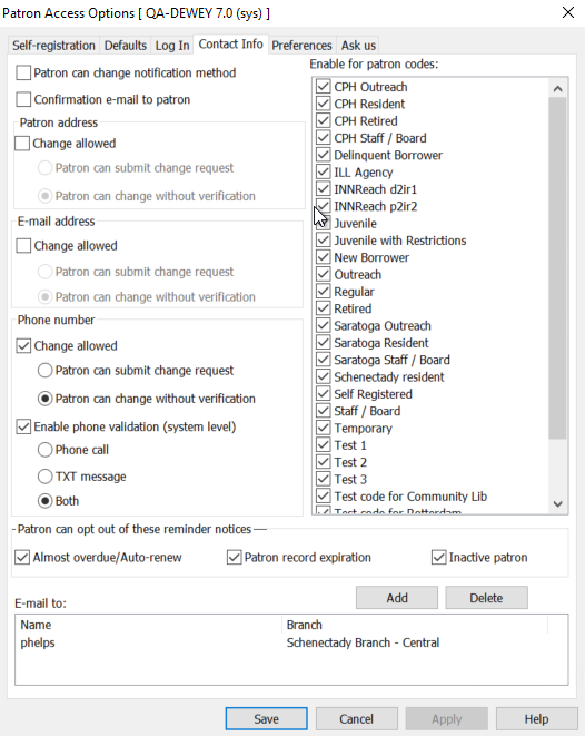 • Patron can submit change request places a verification block on the patron account when the patron requests a change, and an email message is sent to the address specified on this tabbed page.