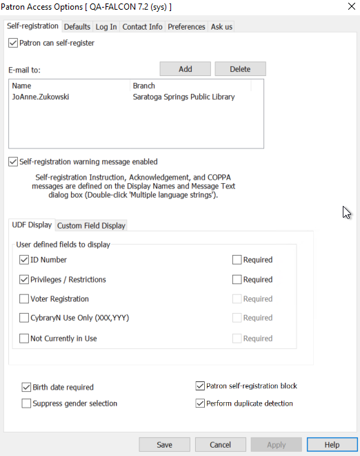 4. To require a duplicate detection check on a patron's information during self-registration, select Perform Duplicate Detection. To disable duplicate detection on patron information entered in PowerPAC, MobilePAC, or Polaris API, clear Perform Duplicate Detection.