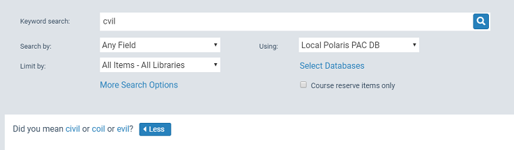 Patrons can set various options for each type of search in Polaris PowerPAC. For example, for keyword searches, patrons can set a search field (Search by) and search filter (Limit by) for the search, and then sort the returned results by any of several options.
