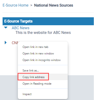 Right-click the e-source target you want to link to and select Copy link address or Copy link. (The name of the menu option might vary by web browser.)
