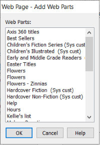 Custom web parts must be defined at the system level before they can be assigned to public pages at the branch level. See Create a custom web part. Web parts set up for Polaris PowerPAC are available to be assigned to Children’s PAC pages, and web parts set up for the Children’s PAC are available to be assigned to Polaris PowerPAC pages.