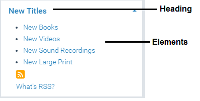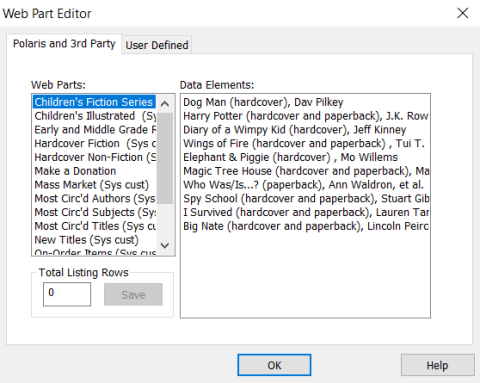To create a custom web part, you define a heading for the web part and add data elements to the heading. You can add any combination of elements to the heading. (You create web parts for Polaris PowerPAC Children’s Edition separately from Polaris PowerPAC, but the method is the same.)