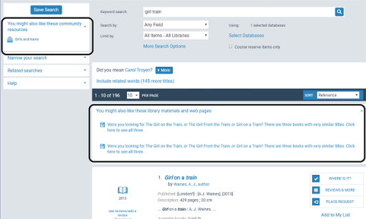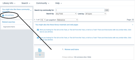 For library (bibliographic) material, the list header is You might also like these library materials and web pages. For community information, the list header is You might also like these community resources. For a merged list, the header is You might also like. You can edit the headers in Polaris Language Editor (WebAdmin). The language string IDs are: