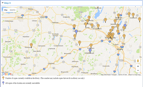 When the patron clicks or taps Map It in the title product page (full display), a map displays bubble markers for branch locations that have linked items.