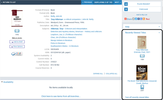 The list is available as long as the current session is active, and is cleared when the browser is closed or the session times out. It is available regardless of whether the user has logged in. The user can disable the feature for the session by clicking or tapping Turn off recently viewed titles. This action clears the list; the user can start it again by clicking or tapping Turn on recently viewed titles.