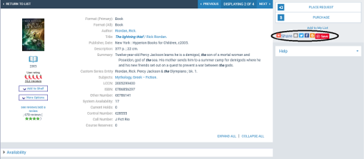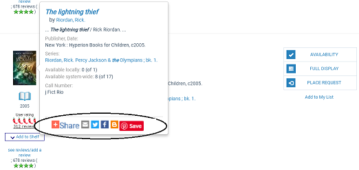 If you enable bookmark sharing, icons representing popular bookmarking sites are displayed on the summary view when the user hovers the cursor over or taps a book jacket image in brief Polaris PowerPAC search results, and on the product page for a title.