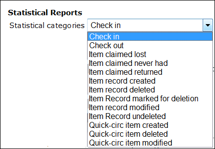 Note: The statistical categories depend on the kind of statistical report you are creating. For example, for an item statistical report, you could report on transactions involving item records, such as check outs, check ins, or modifications to item records.