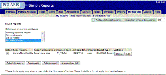 - Select Bib MARC Export in the Saved reports list to display reports saved in this format.