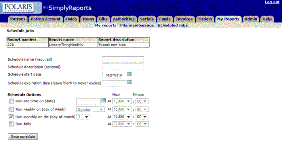 - Click Save schedule. The LibraryThing file will be created on the first of every month containing the titles added within the month previous to the report run date. The file is created and saved to your desktop automatically, but you must send it to LibraryThing according to the company’s instructions.