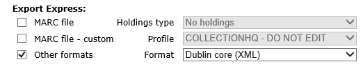 - MARC file - custom. If you select this option, you choose a custom export profile in the Profile box. See Using Export Express.