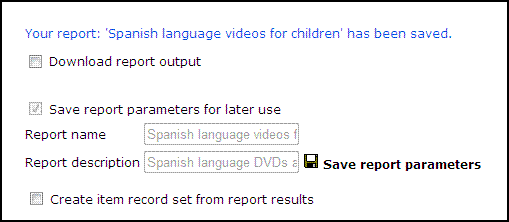 - Type a name for the report and a description, and click Save report parameters. A message at the top of the preview window tells you that the report was saved.