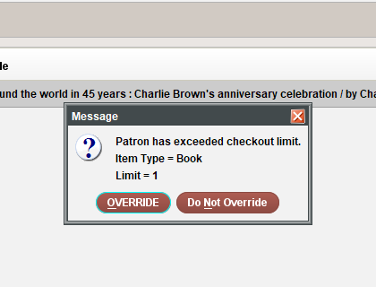 Once a patron has reached the limit set up for their location, item type and library location, the following screen appears when they try to checkout additional items: